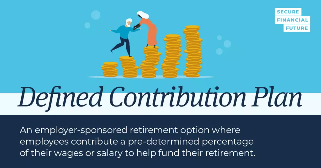 A defined contribution plan, such as a 401(k), 403(b), or 457, is an employer-sponsored retirement option where employees contribute a pre-determined percentage of their wages or salary to help fund their retirement. Some employers will match a certain percentage of the contribution based on their benefit blueprint.